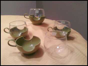 I thought, to make up for the disappointment I would hit up a few of the nearby thrift stores. I fared a little better at Goodwill. I found these interesting Pyrex coffee mugs from the 60's-70's. (Sorry for the horrible pictures. They're from my crappy phone as I left my camera at school.)I had never seen anything like these before. They are clear Corning Ware glasses with plastic, removable bases. They caught my eye right away and then I turned one over and the bottom said PYREX and the price tag said $.69...SOLD. I only bought 4 out of the 12 they had. Other than these, nothing I was looking for. And a big fat nothing at Value Village and St. Vincent de Paul. :(